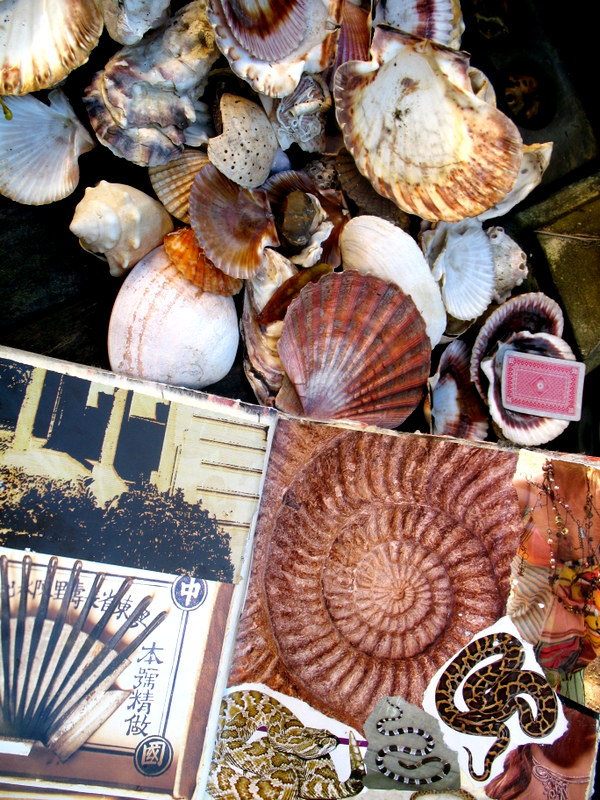 I wanted to get a photo of the stack of shells on our garden table as the colours suddenly jumped due to a shower of rain. My scrapbook fell open in a perfect place.