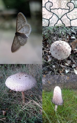 Massive toadstools this year, washed out colours and an obliging moth on the window.