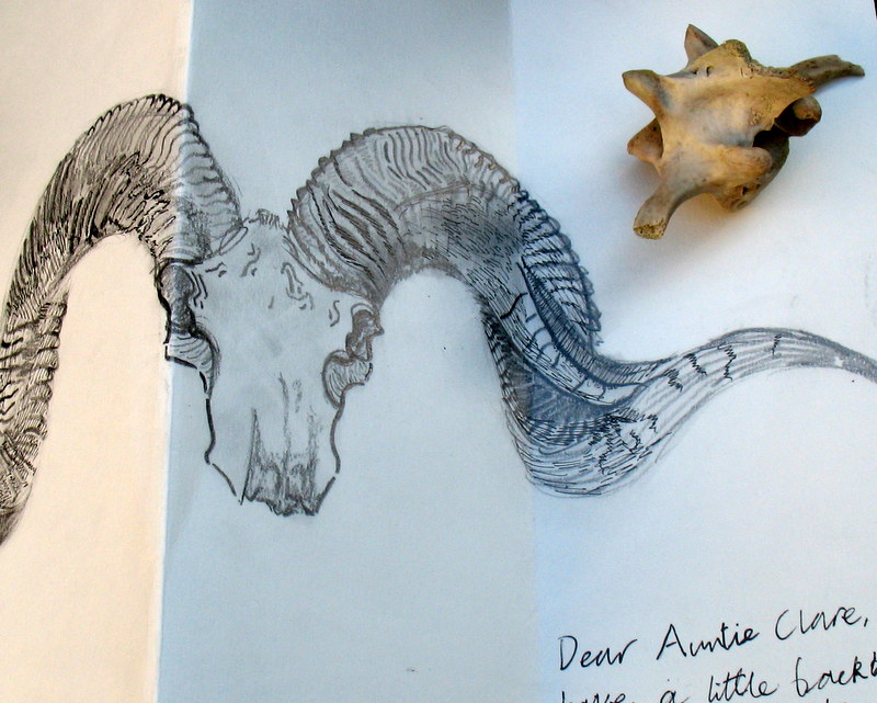 A splendid, unsolicited gift of a drawing and a bone (we exchange these things) from sharp-eyed and skilled young nephew Owen.