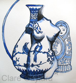 Delft, Ming, Ghzhel, tatoos, indigo dyed fabric. Floor to ceiling cabinets of blue and white china in the British Museum and the dangerous stacks of it in Bangkok's Chatuchak Market, I love it. Its been nearly ten years since we left Thailand and my mongrel collection of blue and white pottery is sadly thinned out. A good enough reason to reach out for the colours in my glass.