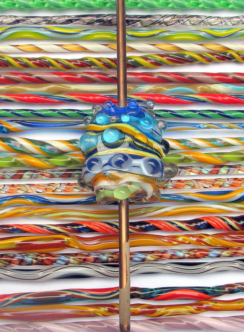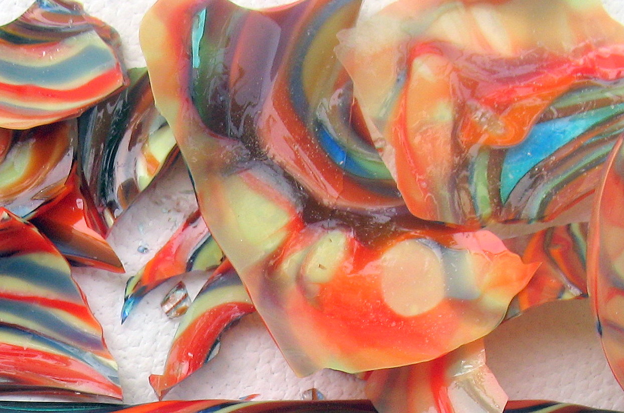 Well the colours are hot compared with the bleached tones of my organics. The glass shards have a lovely random quality and my children enjoy legitimately breaking glass. Although it requires some control to break it into useable fragments without grinding it to dust. I made cane on the right, which is mixed and pulled while red-hot. The unique colour twists give detail and depth to fine work.