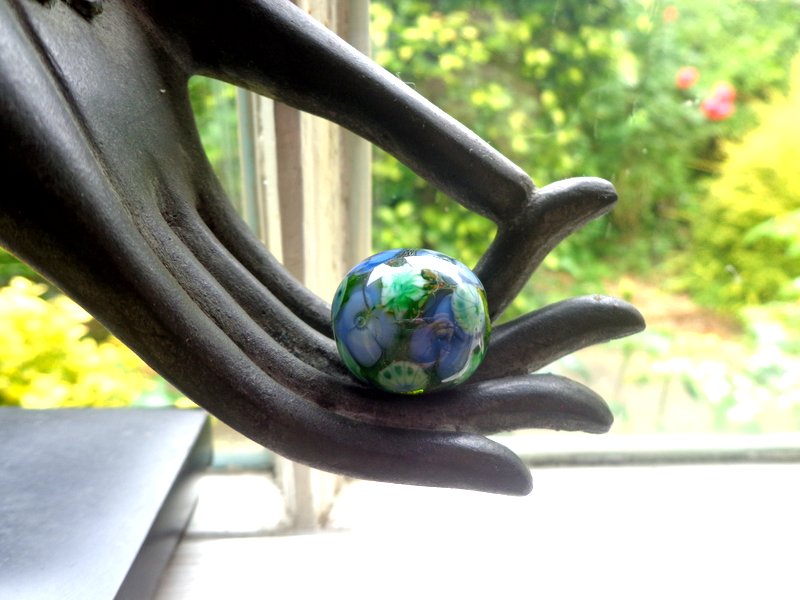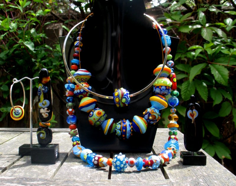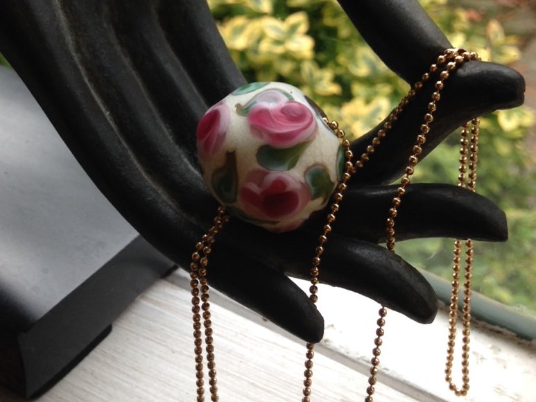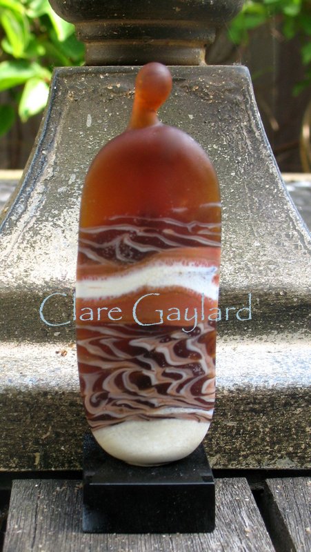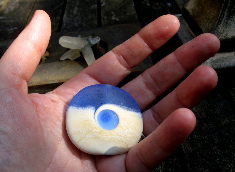 'To see a world in a grain of sand and heaven in a wildflower'..Blake expresses beautifully the kind of miniaturism I get so caught up in. This encased, floral, focal bead contains two types of my handmade cane and is rolled in raku frit for texture and depth. Frit is roughly crushed glass and raku frit strikes different colours in the flame, giving a lovely dappled effect.