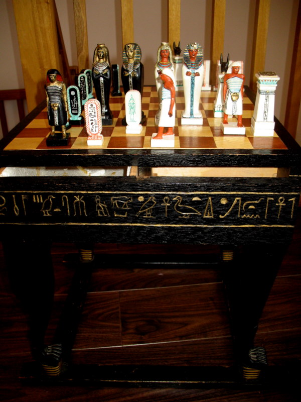 My grandfather was fascinated by Egyptian antiquities and made this tribute in his spare time. The chesspieces tuck away into secret drawers which I have pulled slightly open for this dodgy photo. Each piece is elaborately painted with a level of detail not picked up here. In a family of seven children the treasures get rationed out and I somewhat reluctantly delivered this to one of my brothers at New Year.