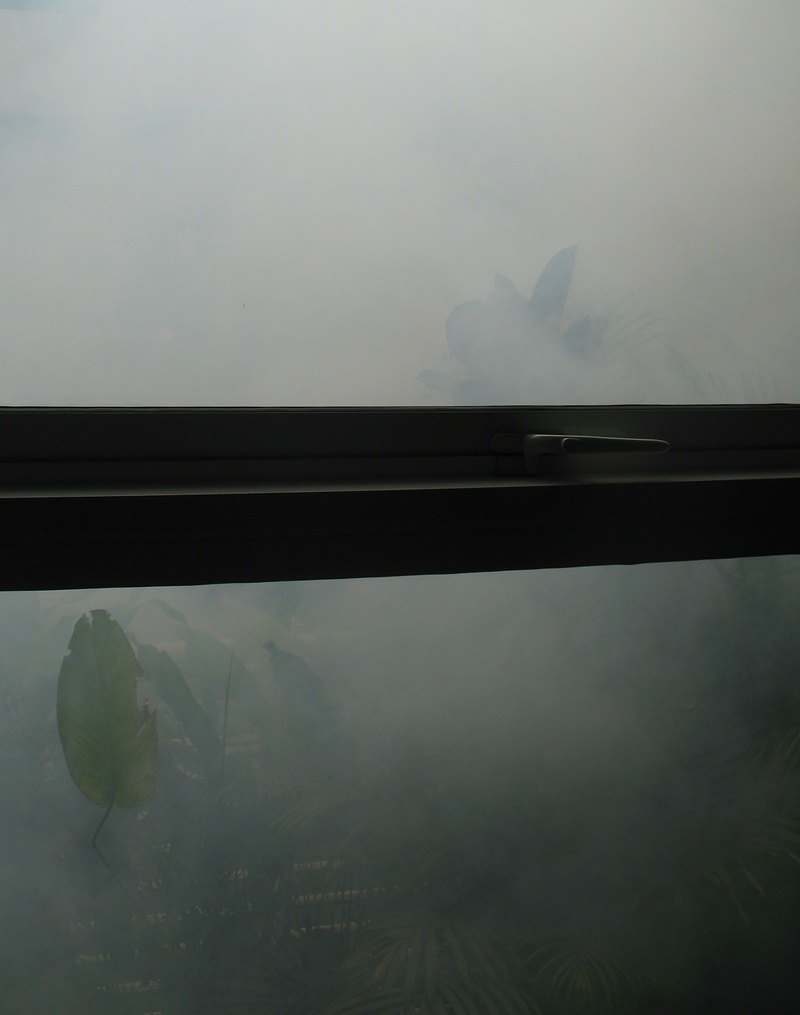 It's a metaphor for an artist's block! Every week the 'Foggers' come with roaring tools and masks to eliminate the dengue mosquitos and so rapidly the very strange (almost apocalyptic) becomes routine.