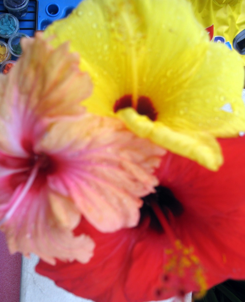 Slightly out of focus but still beautiful, hibiscus, a gift from a generous neighbour's garden. The red one is Malaysia's national flower AKA Bunga Raya. They only last a day or so, hence the fuzzy, uncorrected shot.
