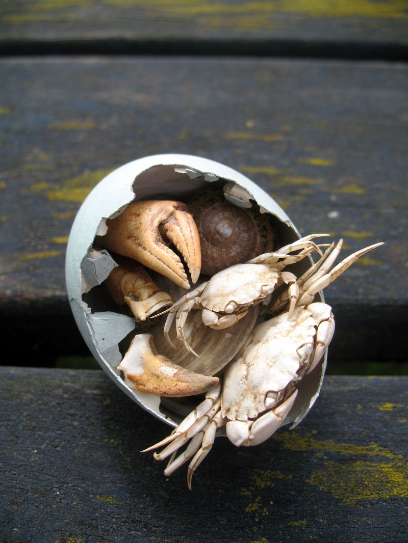 All dead but still full of colour and movement. The duck-egg cornucopia evolved from the most practical way to carry these a few miles of walk without reducing them to powder. The girls can't decide if it is more beautiful or sinister. I put them together and confirm to myself they are certainly both. I remember somebody saying: 'Nothing is lost from the book of the soul' and this is definately a recording of lost things. Another friend says it makes her think of a good seafood lunch and I make the mental leap and say the slice of lemon would be missing. Viva le difference.