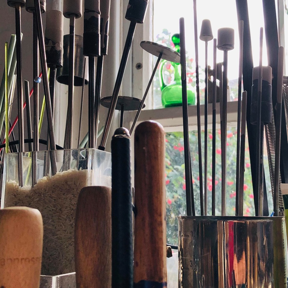 A good range of mandrels primed and ready to go, sunshine valiantly trying to get through a very dusty window, the Victorian glass, laudanum bottle on the windowsill is purely decorative.