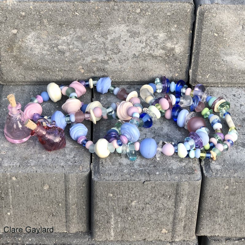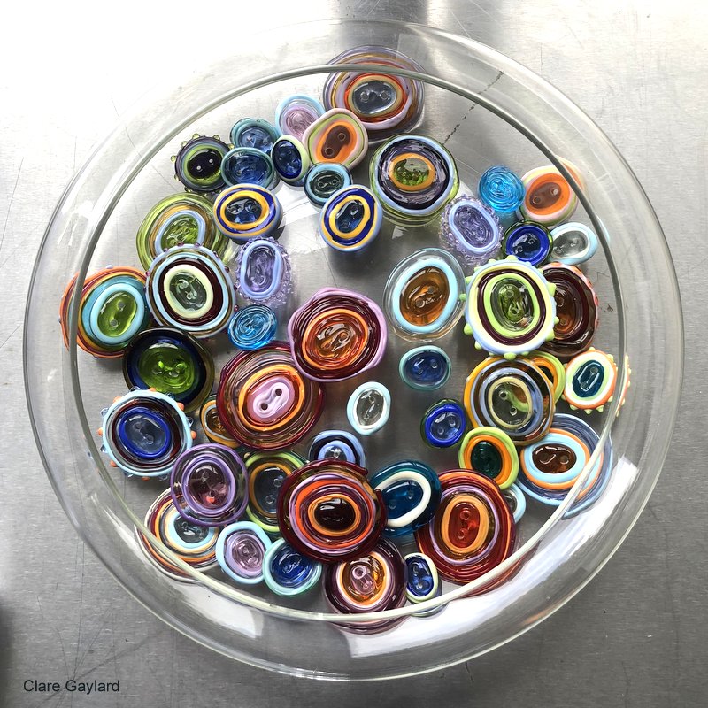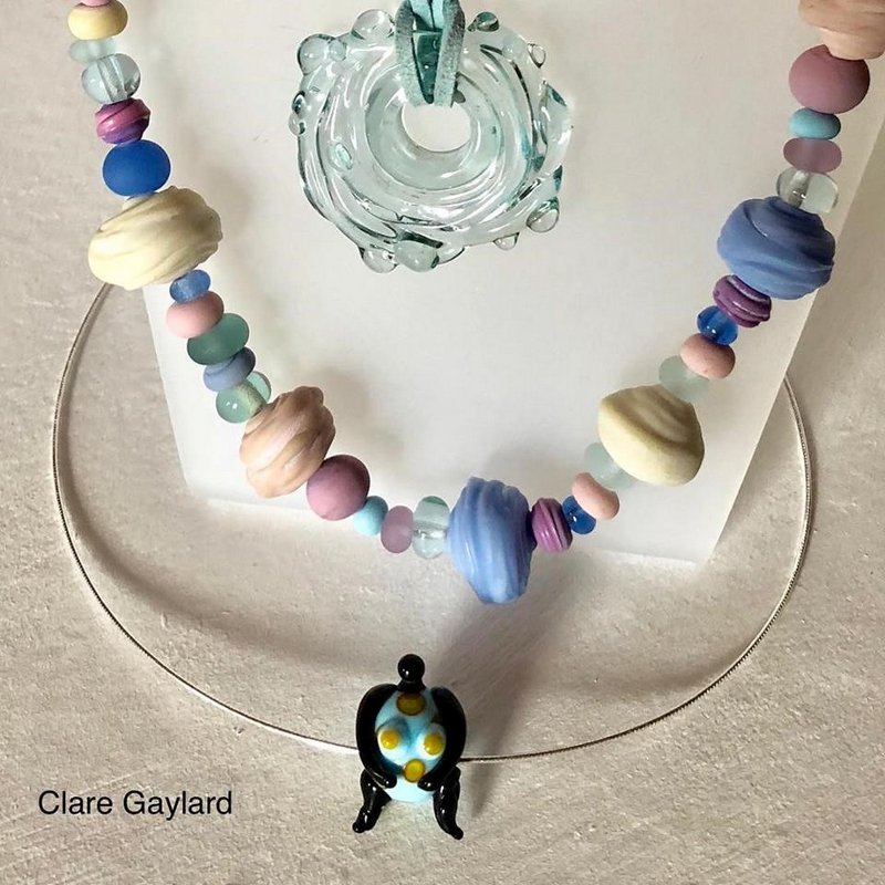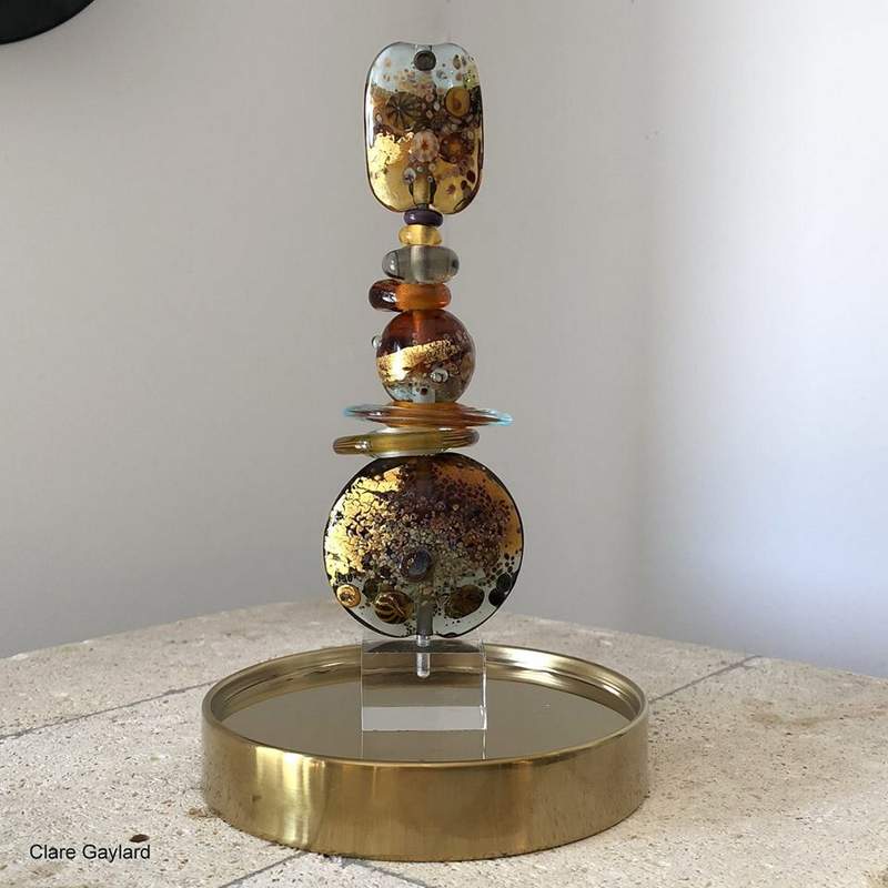 Studio shot of 'Sol' a totem of ten, loose, wearable glass elements. Handmade murrini, 24 carat gold leaf, all forming and detailing done directly in the flame. Currently at the Suffolk Craft Society Summer Exhibition in Aldeburgh. I started on this theme during our very cold, grey, spring and it seems to have conjured the sun.
