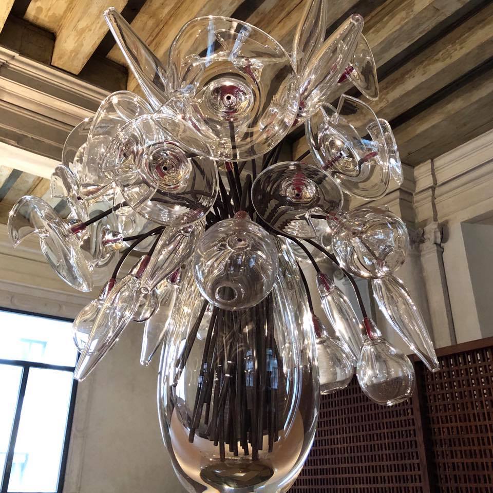 ‘Love Letter to a Museum’ necklace includes the following glass elements which were all (inc gold leaf) entirely sculpted in the flame: 3 amphorae, 4 spheres, 6 leaves, 10 planets, 10 raindrops, 20 loops and 64 other miscellaneous glass beads.