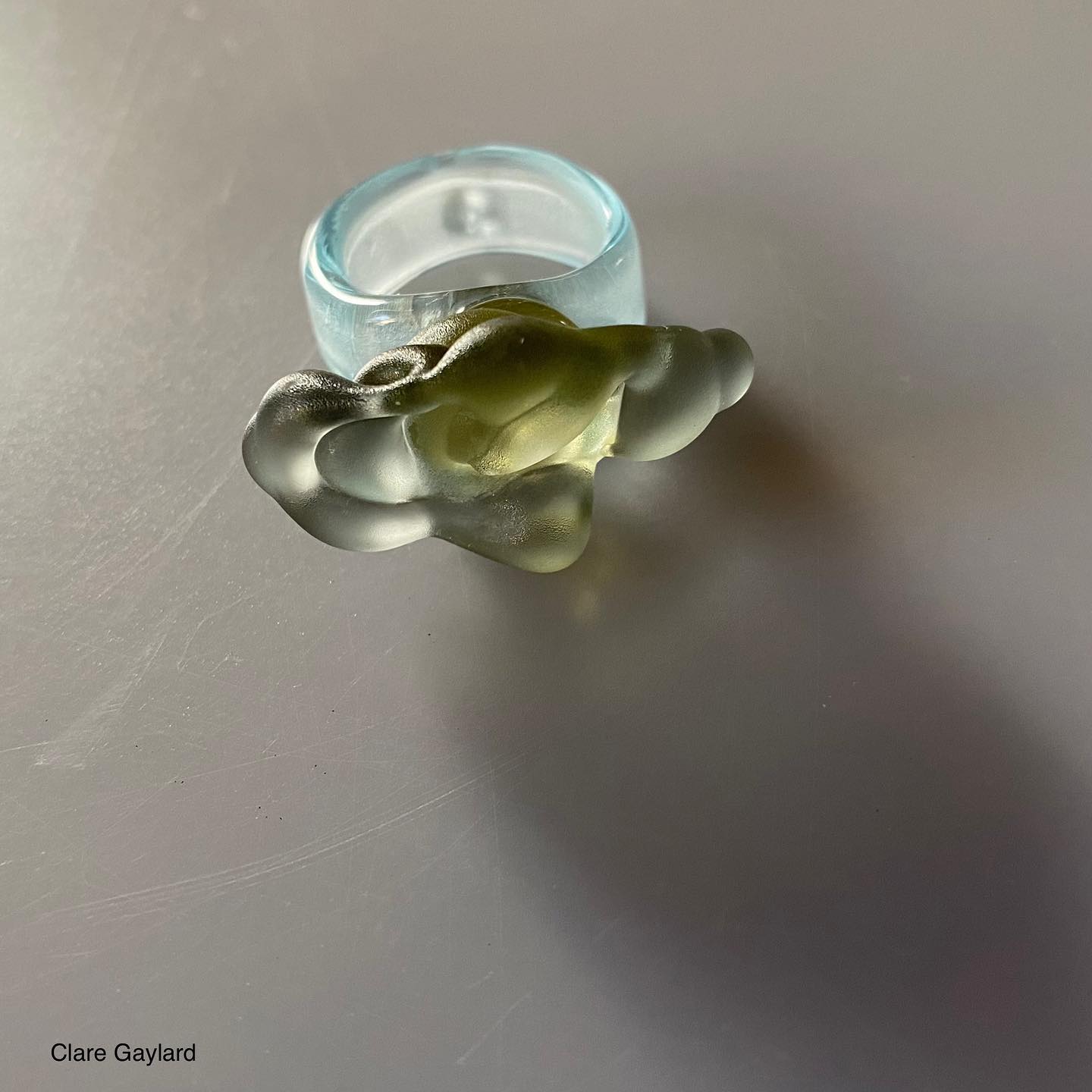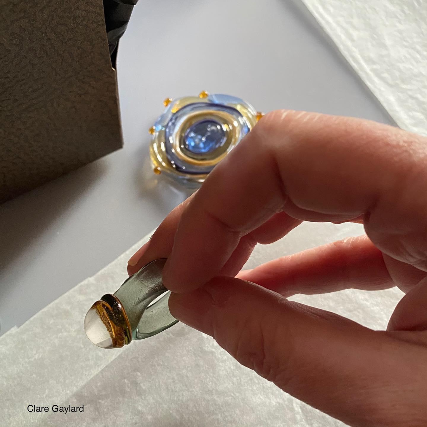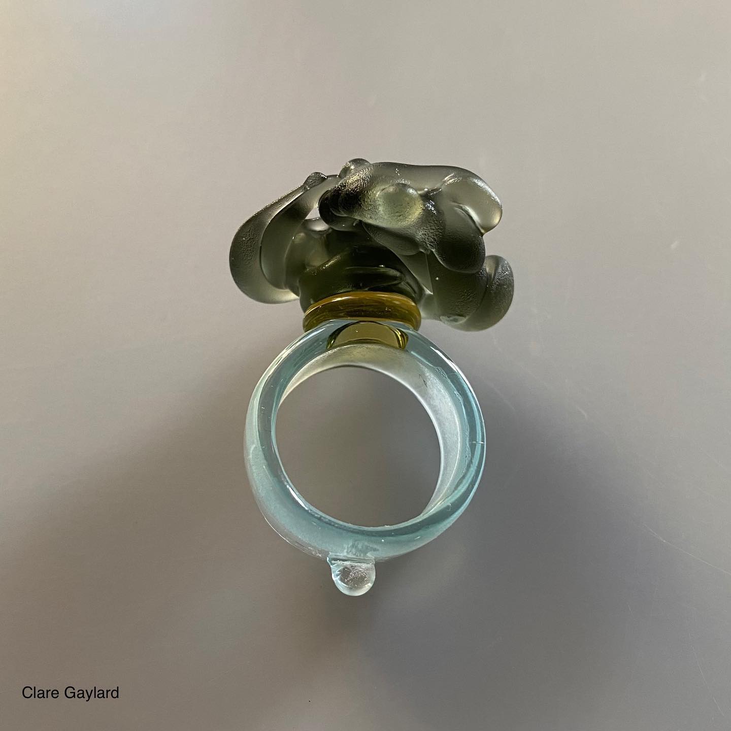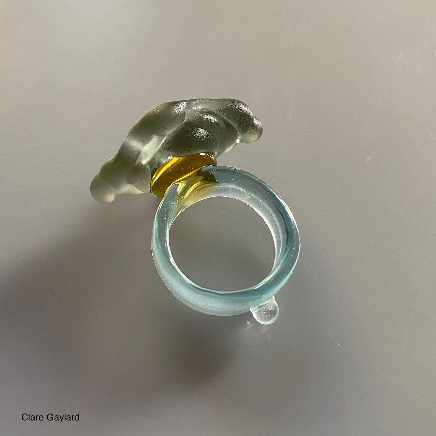 One of three delicate yet substantial, glass Rockpool rings currently with Old Harnessmakers Gallery. With seaweed detail trailed around the back.