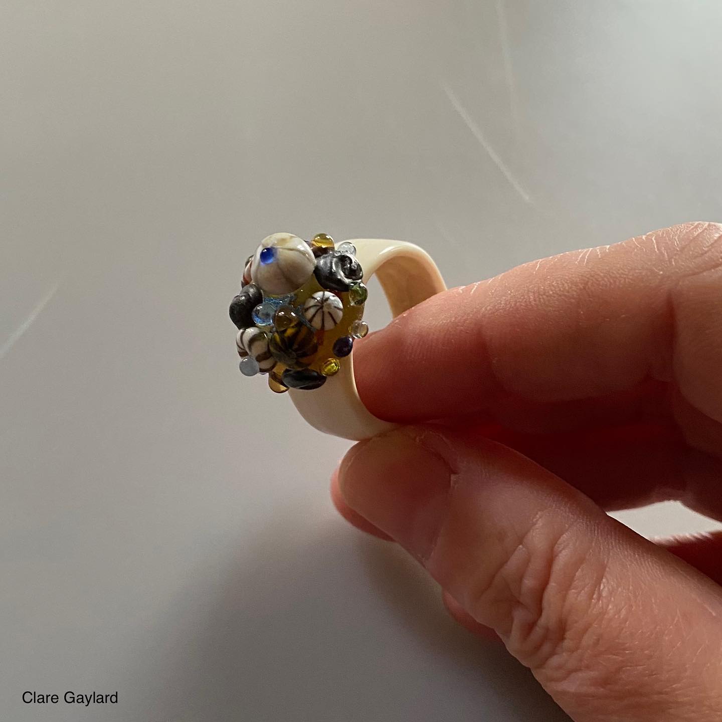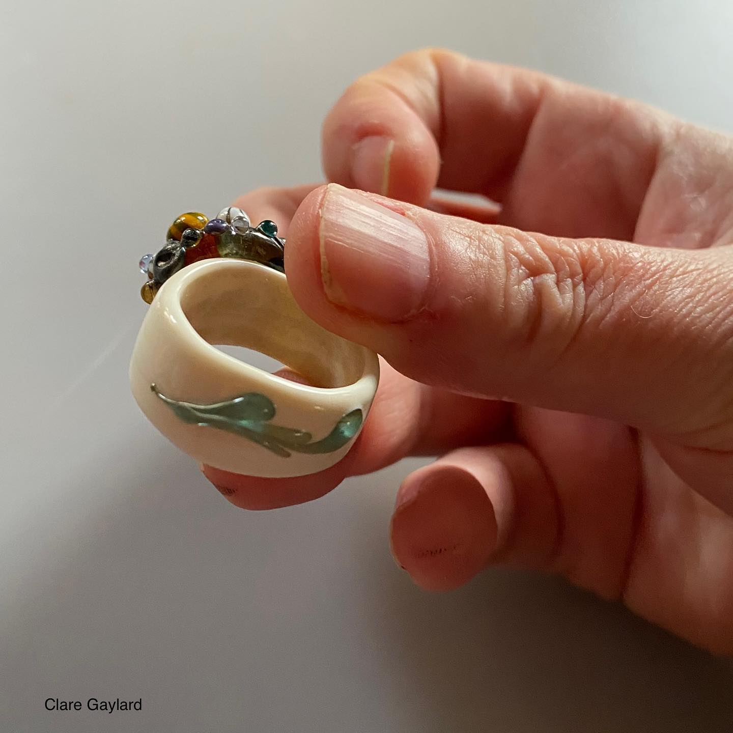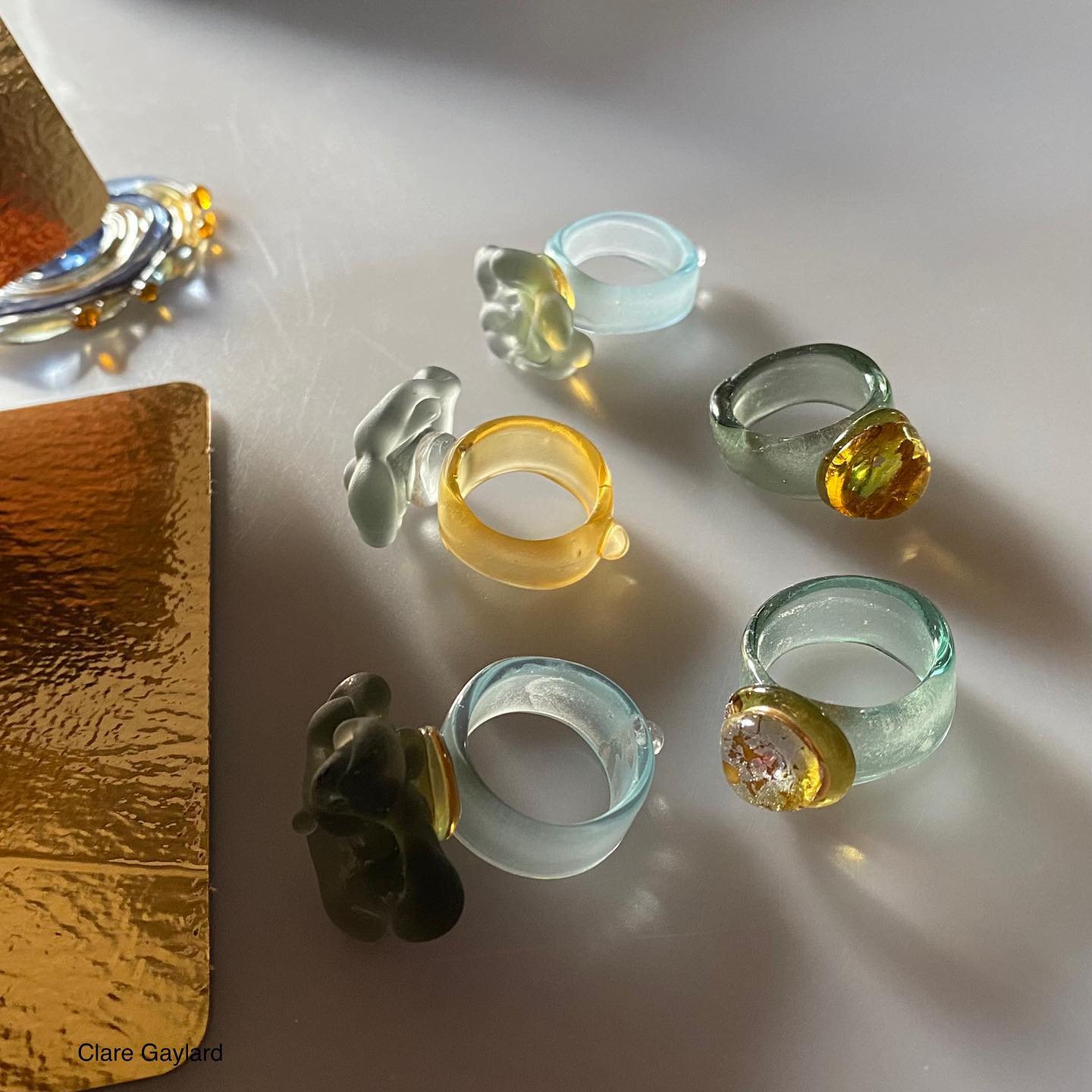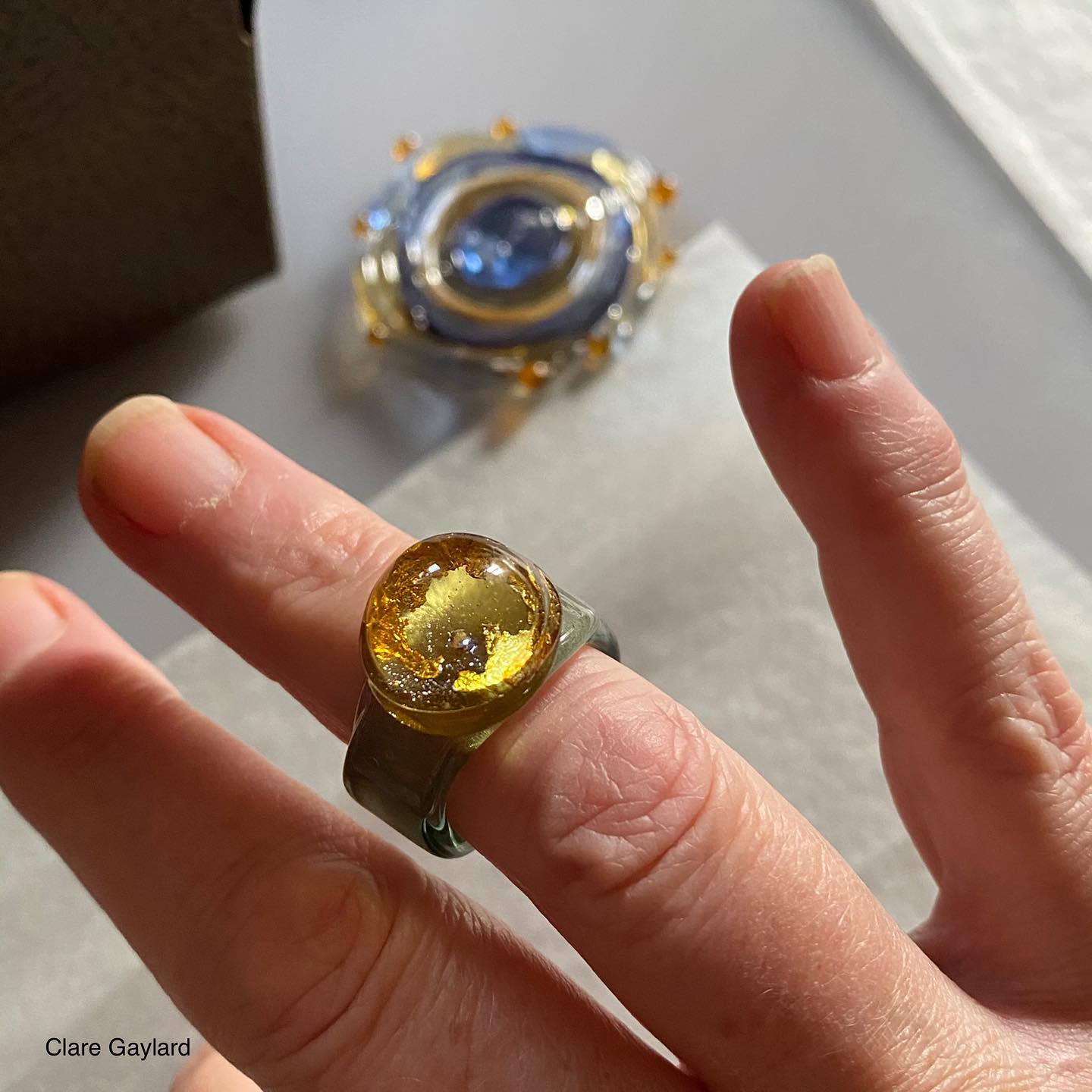 One of three delicate yet substantial, glass Rockpool rings currently with Old Harnessmakers Gallery. With seaweed detail trailed around the back.