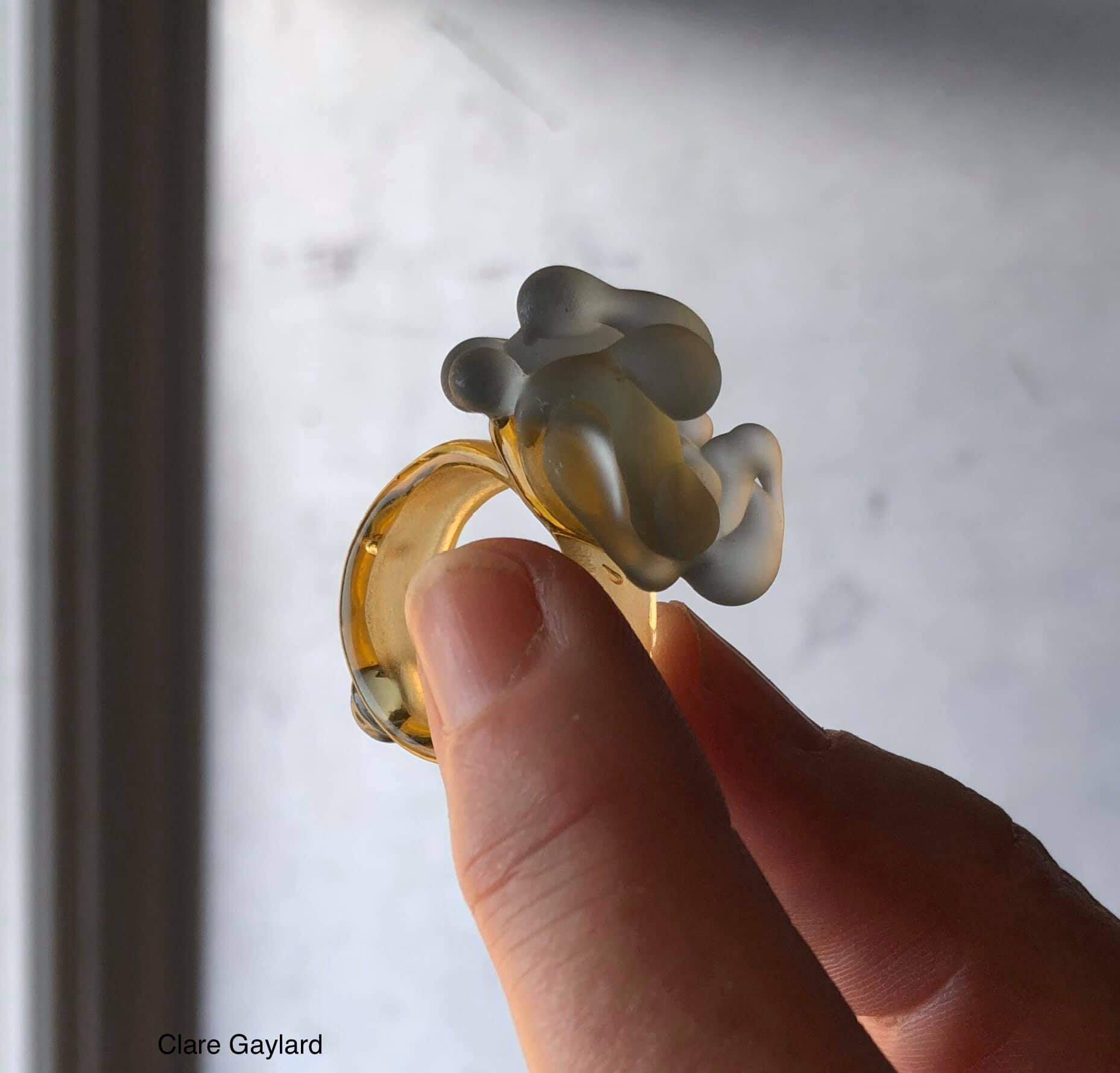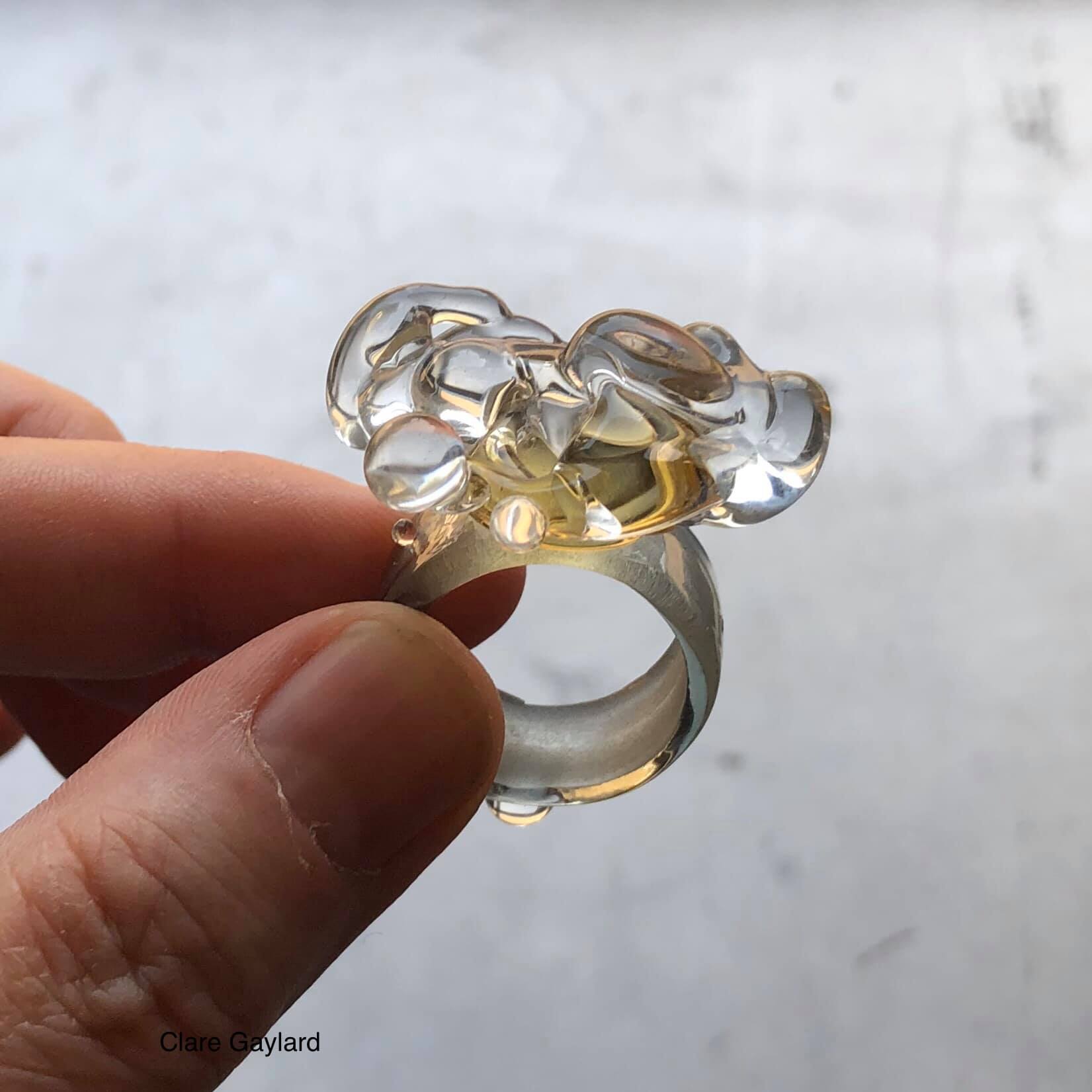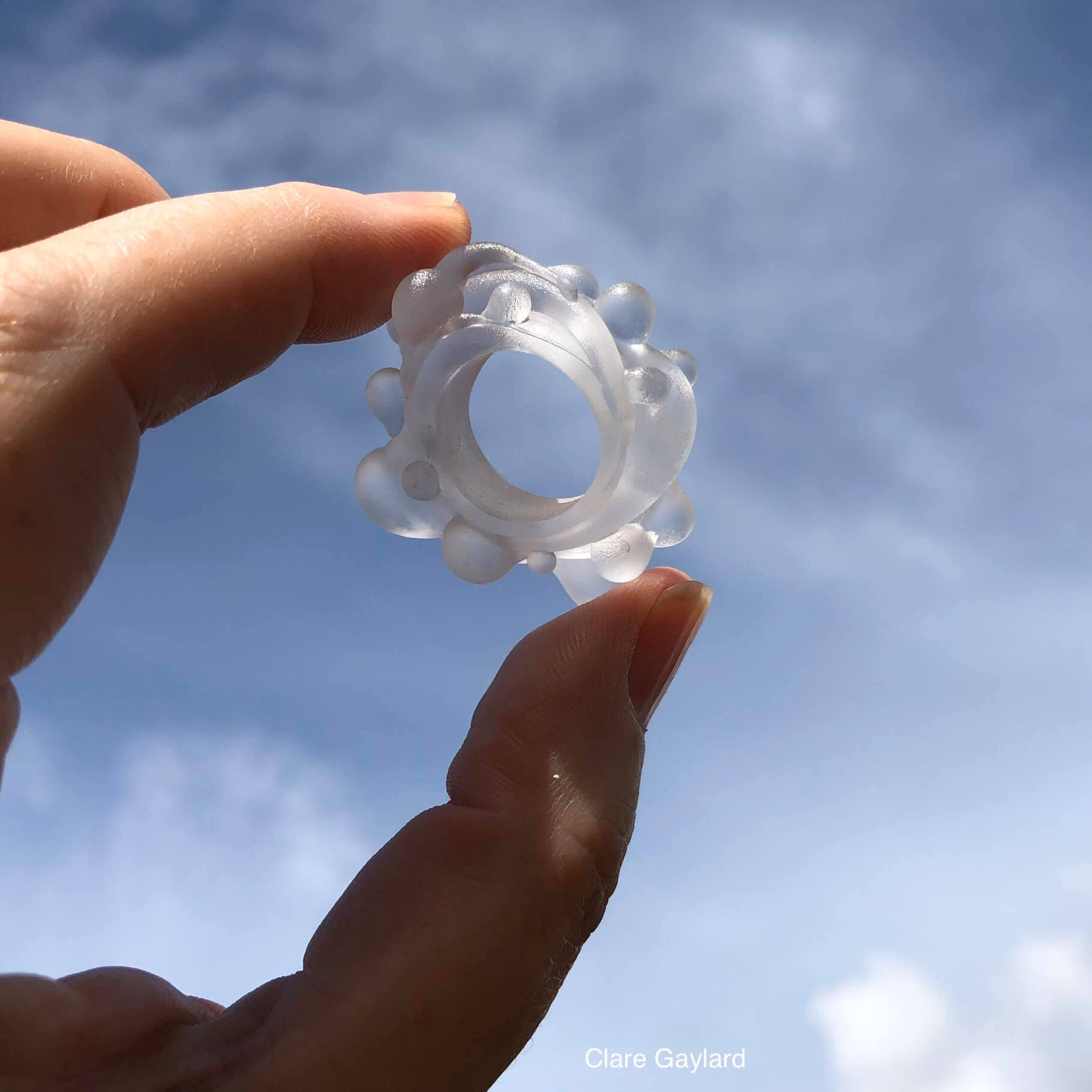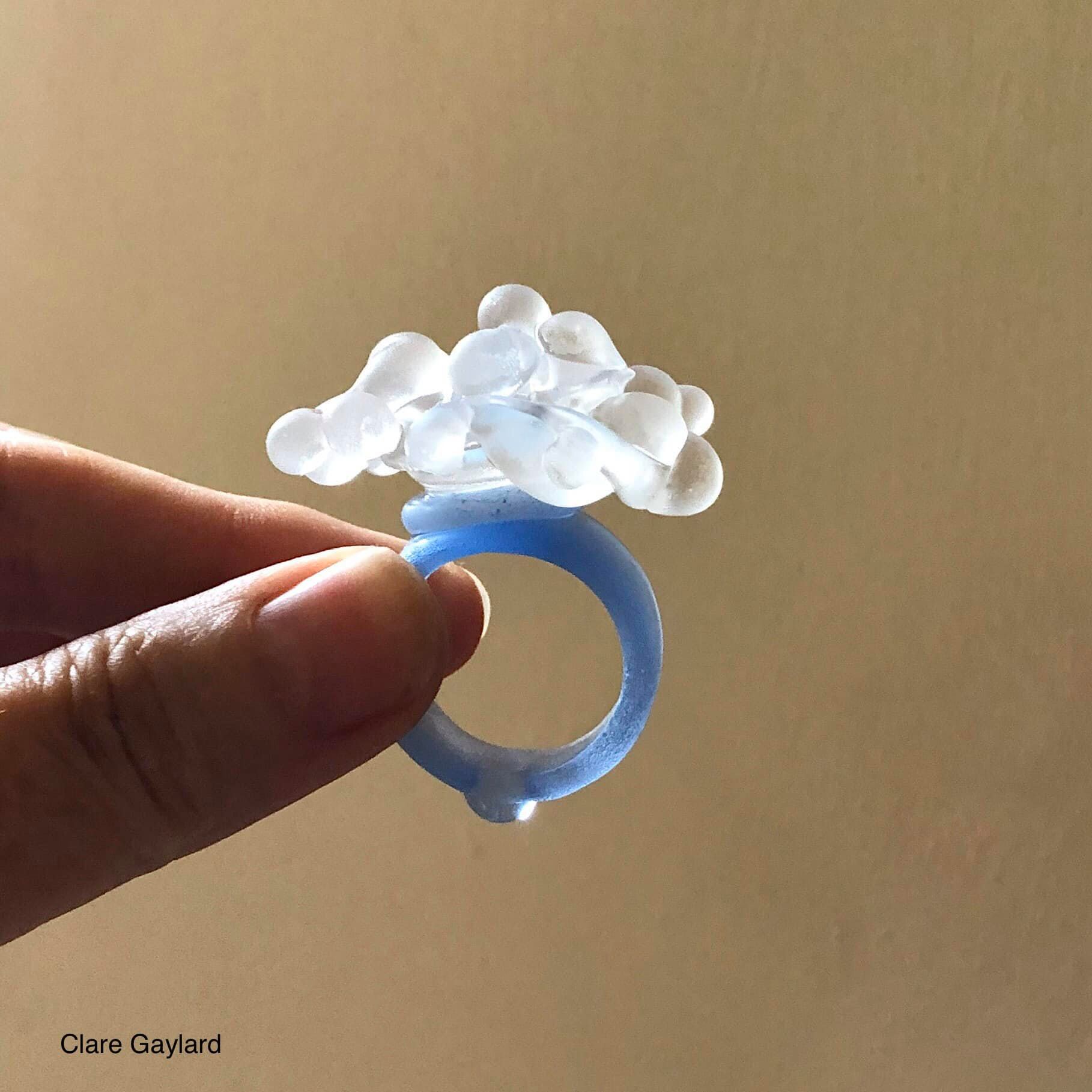 September, Suffolk sky and glass etched Cloud ring with translucent raindrop counterpoise. Sculpted entirely in the flame. Take the weather with you.