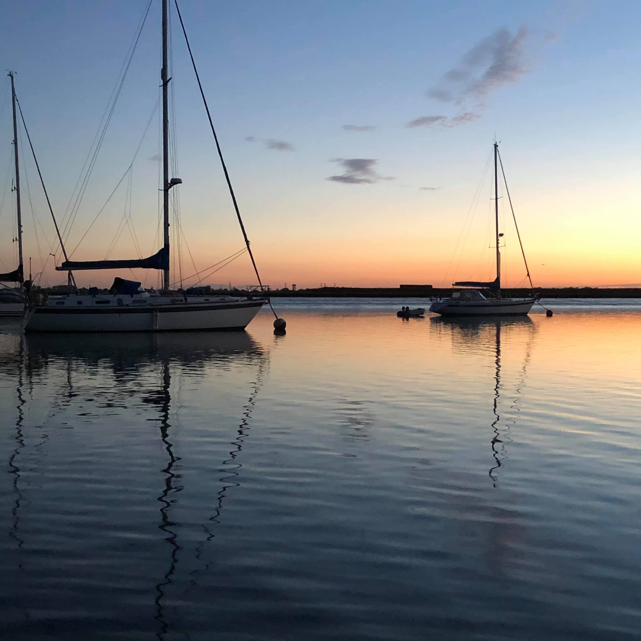 Magic on the River Deben. Felixstowe Docks looking like the riviera, and the blue sphere of the boat compass putting me in mind of my Little World pins.