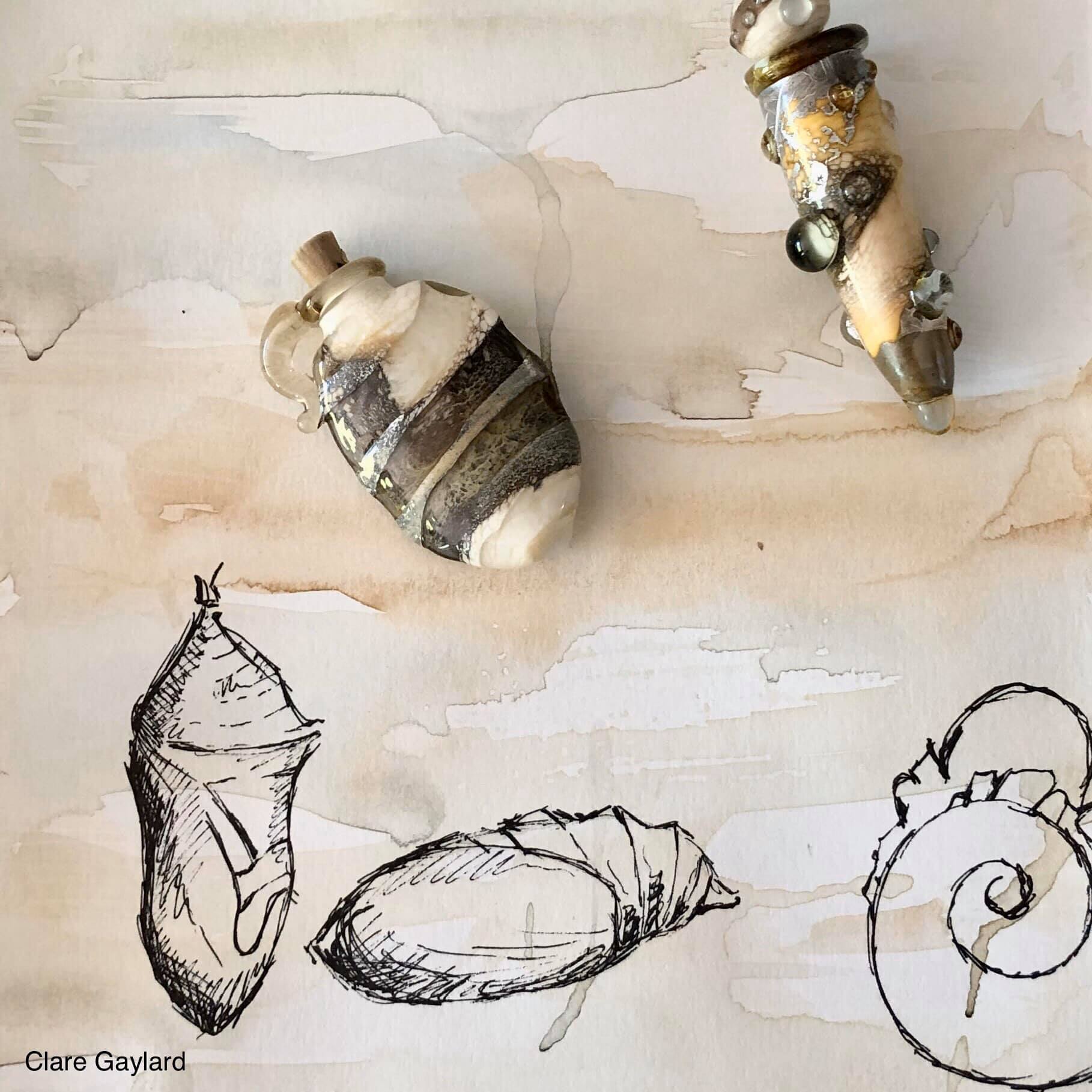 Sketchbook page with Cocoon and Caddisfly case silvered-glass vessels.