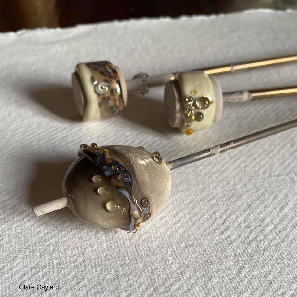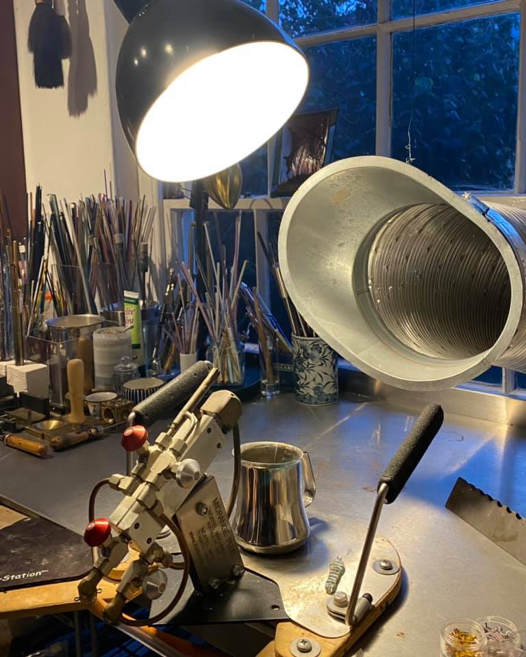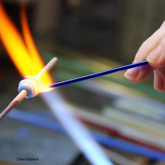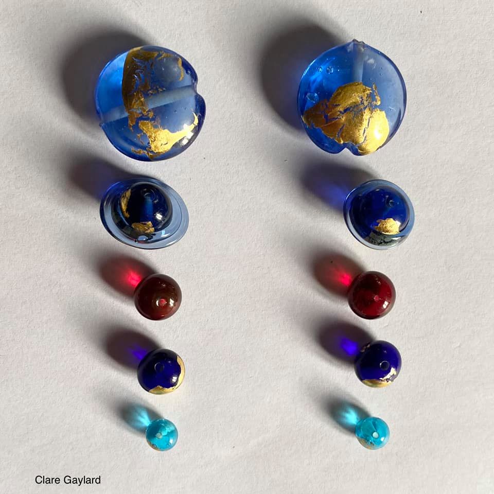 Practicing alignment. Jewel-like, glass, planet orbs shaped and gilded, one at a time, in the flame.