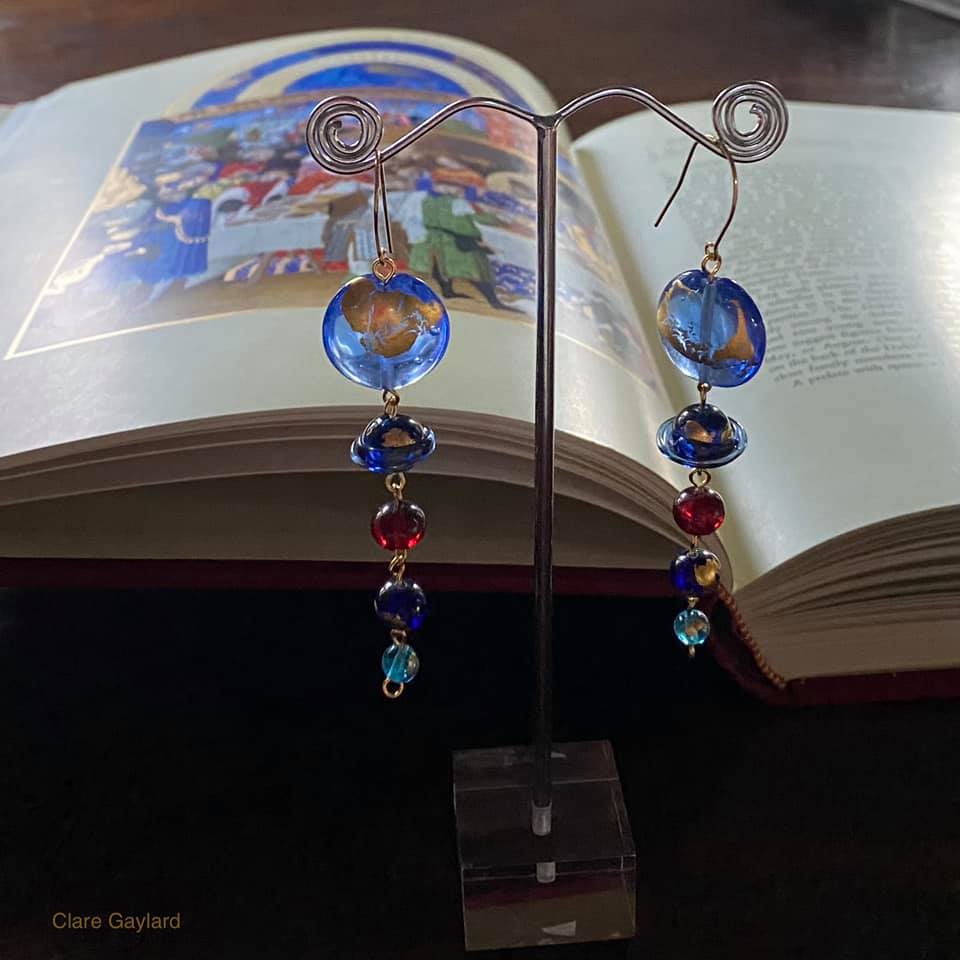Celestial Bodies, little, gilded planet earrings emerging from rich hours spent with the Duc de Berry. Against the page for January. #tresricheheuresduducdeberry