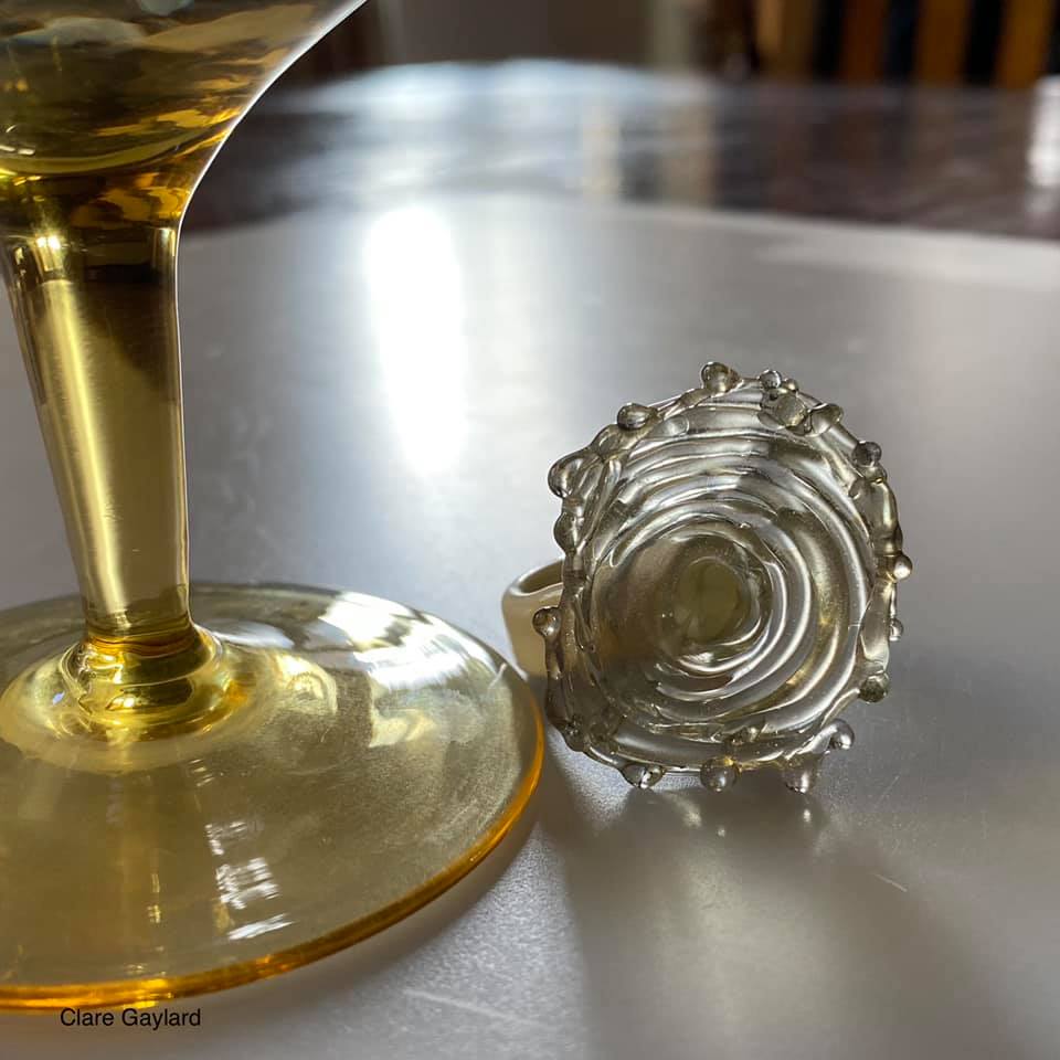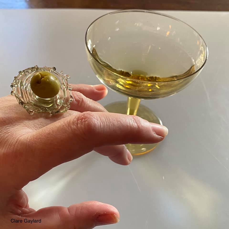 Question: Is it really a Cocktail Ring if it’s not capable of holding an hors d’oeuvre? The opaque glass is actually CALLED Dirty Martini and the transluscent glass is Antique Green (it has a slightly stippled effect) I WAS asking myself that question when I made the ring but didn’t realise how apt my colour choices were. Cheers!