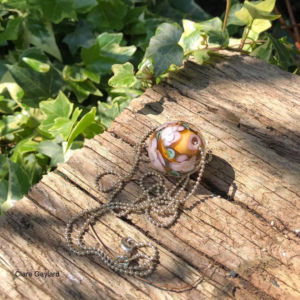 Floral focal bead in pink, amber and Celadon.