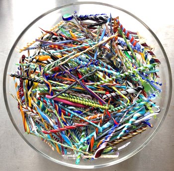 I make a lot of twisted cane when I'm doing demos for Open Studios and the last couple of centimetres are of limited use, but too pretty to throw away - my stash continues to grow.