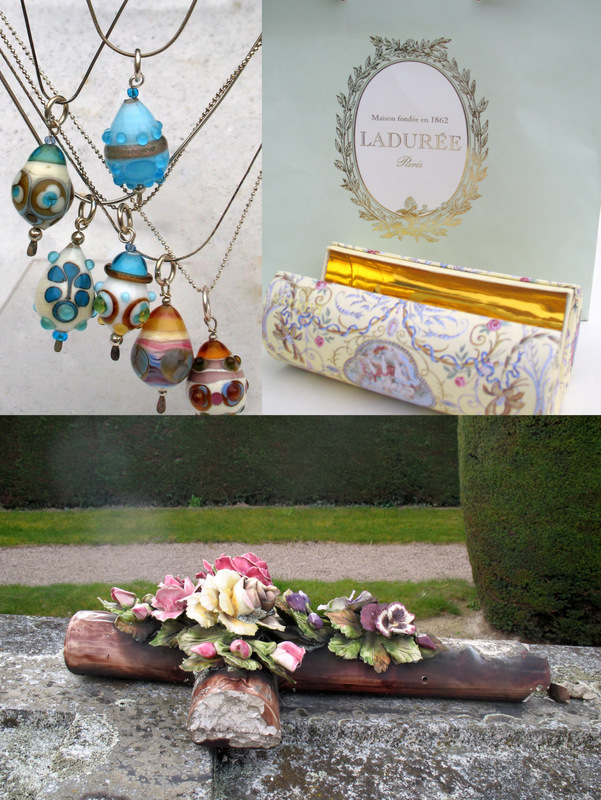 Some of my glass eggs, macaroons from Laduree in favour of a real egg (the packaging is worth keeping) and ceramic flowers on a cross from a graveyard in Dol de Bretagne.