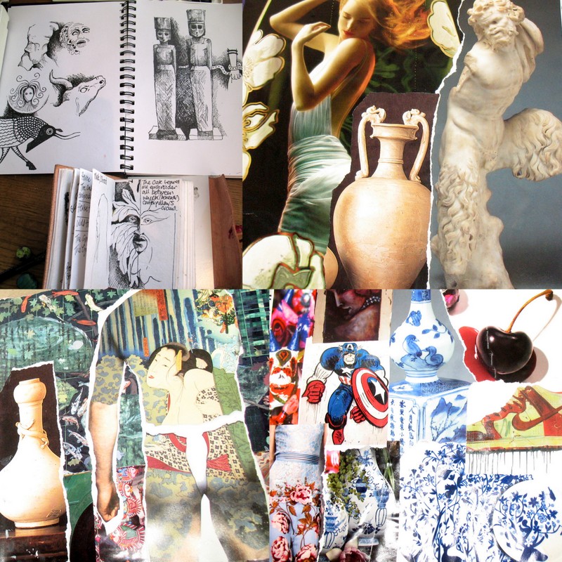 A schoolchild asked me last weekend how I 'get' my ideas. I have kept sketchbooks and scrapbooks since college. Some ideas and images take hold deep and fast, but others need to be recorded and digested. These books are resources, diaries and catalogues. I use ink in my sketchbooks so I can't clean up and edit too much and I tear the pictures for my scrapbooks so I can't get precious.