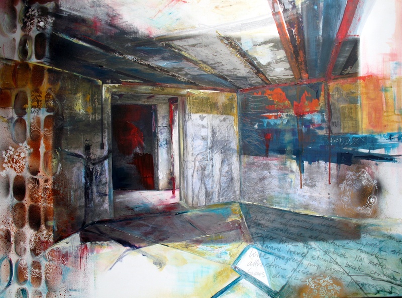This is a large painting halfway through its creative process. We have two pieces of combined work going into our auction and this is one. All four artists take a turn and we live with the results. It is quite intimidating, making marks on a canvas already worked into by one or two other artists, but there is also a sense of being liberated from responsibility and choices. This canvas still has one artist to go.....that is me.