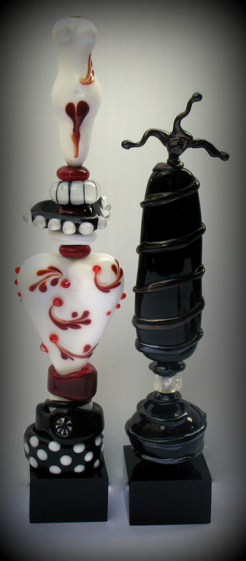 Queen of Hearts and Dark Jester are there, rather severe and Venetian among a welter of pastel colours that took me by suprise. One of the miseries of working in glass is that most ordering is done online. Being an extremely visual and tactile person who understands handfuls and armlengths rather than weights and measures, I suffer from that. Attending the Flame-Off at Siverstone meant I could pick up handfuls of glass and see them working together immediately.