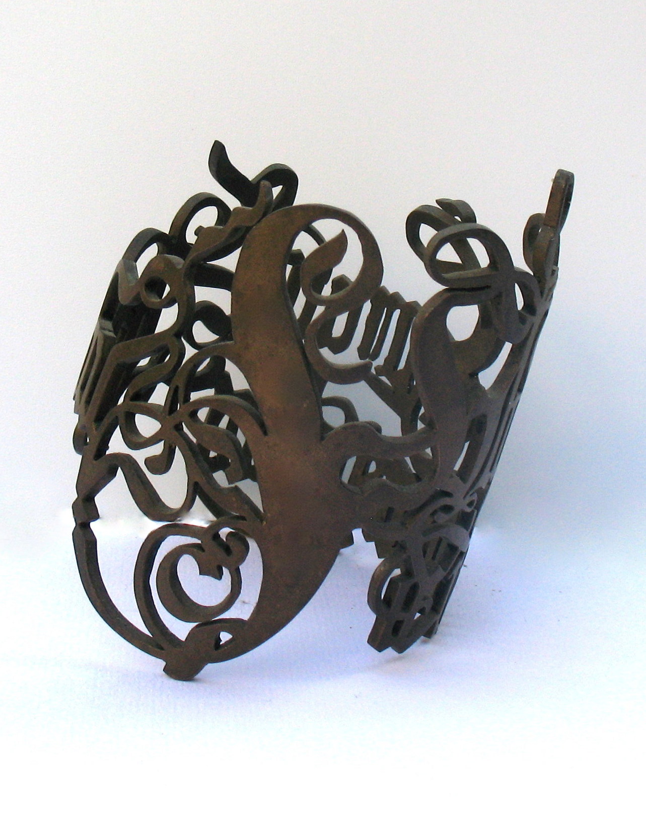 Another piece of metalwork I made during my BA many years ago. I was looking at illuminated manuscripts, prayers and talismans and pierced the 'De Profundus' out of metal to make a necklace then wanted a wafer thin, glinting, gold bracelet. It ended up for unfortunate, practical reasons being a chunky 5mm thick with a scant layer of gold leaf that has since worn off. When people asked what the bracelet said I would say: Season's Greetings.